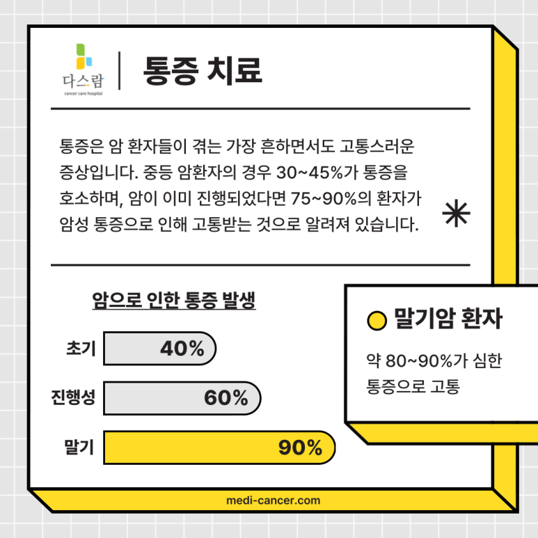 암으로 인한 통증은 개인마다 차이가 있지만 중등도 이상의 암환자라면 통증이 심할 수 밖에 없고 말기에는 통증 때문에 잠을 이루지 못하거나 치료를 받기도 어려워지기도 해요. 이렇게 되면 치료를 아무리 열심히 받는다고 해도 충분한 효과를 얻기는 힘들죠.