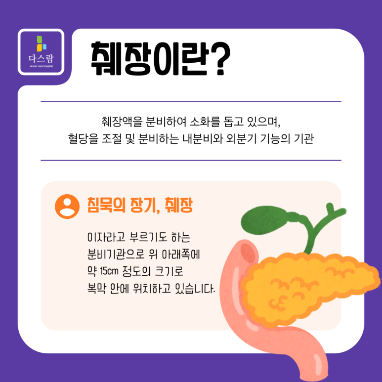 췌장이란 무엇일까요? 건강에 관심이 크게 있지 않은 분들은 췌장 자체를 인식하지 못하고 계신분들도 계셔요. 그만큼 통증이나 이슈로 잘 드러나지 않는 신체부위이죠.