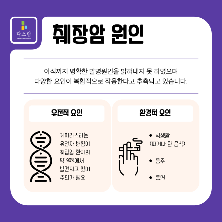 해당 암종은 발병 원인이 아직 명확히 밝혀지지 않았으나 환자의 80%가 60세 이상의 고령환자인것을 미루어 보아, 노화가 가장 유력한 원인으로 추정되고 있어요. 더불어 흡연자의 경우 20~30% 발병율이 더 높아 흡연도 함께 손꼽히고 있어요. 이외에도 만성췌장염, 유전질환, 폐나 두경부, 방광암에 과거력이 있는 경우, 고지방 위주의 식단을 먹는 경우. 당뇨병을 오래 겪은 환자의 경우 발병율에 영향을 미친다고 합니다.