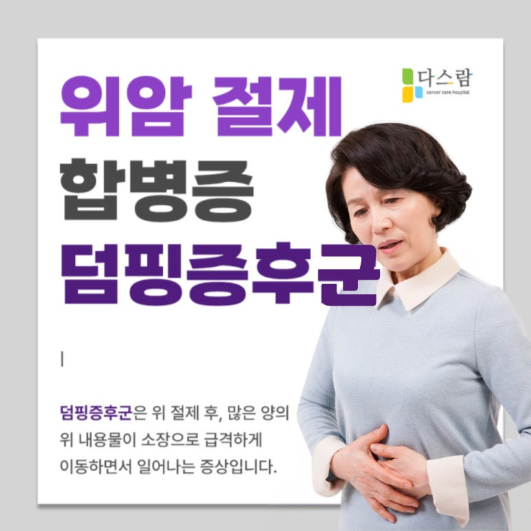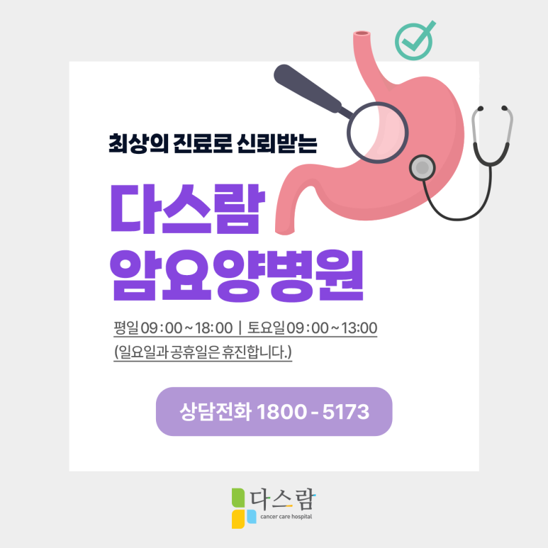 반갑습니다. 서울 경기 주요 암 센터 인근에 위치하고 있어 대표적인 고양암병원으로 찾아주시는 다스람요양병원입니다. 저희 다스람요양병원에는 위암 수술을 진행하고 회복하고 계시는 환자분들이 많이 찾아주십니다. 위암의 경우 식이섭취와 건강에도 직접적으로 영향을 끼치기 때문에 회복에 있어서도 많은 주의가 필요한데요, 음식을 섭취하여도 제대로 분해되지 않으면서 소화 기능에 문제가 생기는 덤핑증후군은 위암 수술 후 찾아오는 대표적인 부작용으로 불리고 있어요.