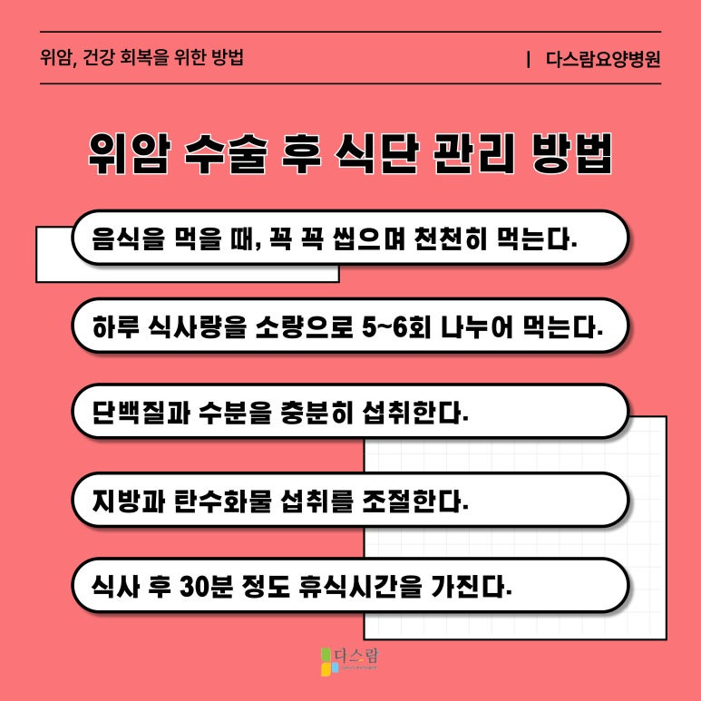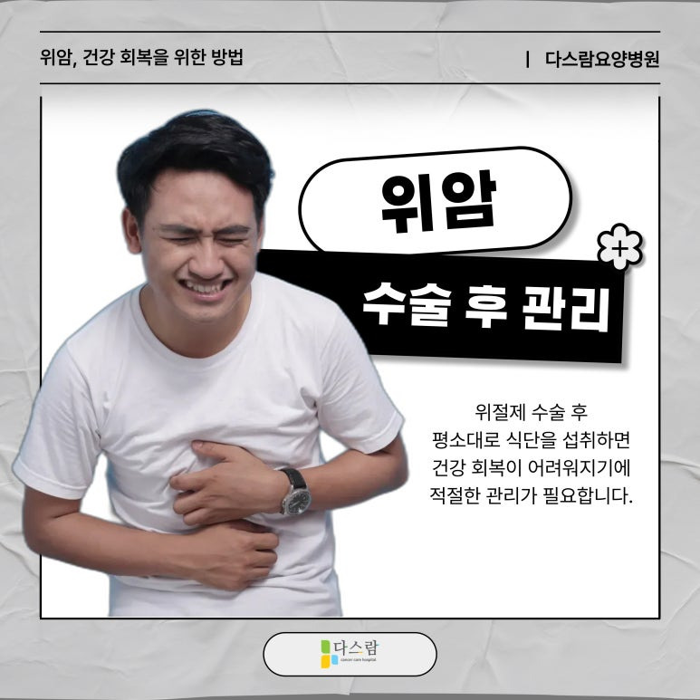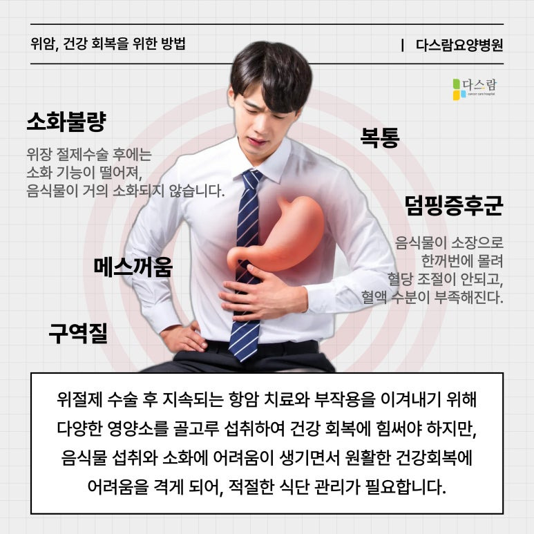 이를 예방하기 위해서는 어떤 방법이 있을까요? 파주 위암요양병원으로 찾아주시는 저희 다스람요양병원과 함께 위암 수술 후 식단 관리 방법에 대해 알아보겠습니다.