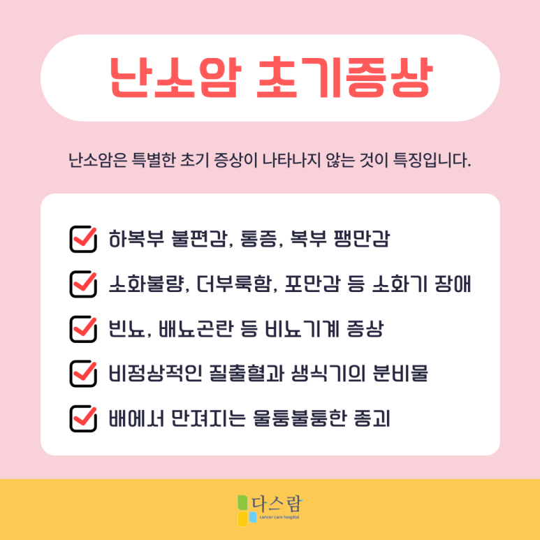 앞서 언급한 바와 같이 난소암은 초기에 증상이 거의 없는 경우가 많습니다. 암이 진행됨에 따라 다양한 증상이 나타나는데, 문제는 이러한 증상이 일시적이라고 여기거나 난소와 관련된 것이 아니라 다른 질병으로 오해하는 경우가 많다는 점입니다.