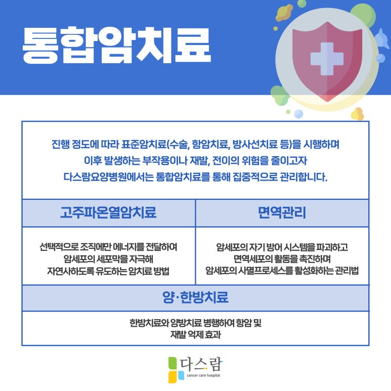 고주파온열암치료, 고용량 비타민 C, 자닥신, 혜리, 미슬토, 이뮨셀, 한방치료 등등 표준 암 치료 과정으로 부족할 수 있는 항암 치료를 추가하고, 부작용과 통증 치료를 병행하여 항암 효과를 높여줍니다. 힘든 항암 치료 과정을 버텨내느라 면역력이 떨어질 수 있어 면역력 증진 프로그램도 포함하고 있어 보다 체계적인 집중 케어를 진행합니다.