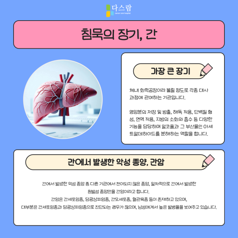 한국인의 사망률 1위는 수년째 변동 없이 암이 차지하고 있습니다. 아무리 현대 의학이 발전했다 하더라도 정복하지 못한 암세포이기에 많은 분들이 암종에 의해 사망되고 있는 것인데요, 특히 간암은 다른 암종에 비해서도 증상이 거의 없어 '침묵의 장기'라고 불리고 있기에 발견하는 것이 쉽지 않죠. 오늘은 경기도 암요양병원으로 찾아주시는 다스람요양병원과 함께 간암에 대해 알아보고, 진행속도를 늦추는 팁에 대해 알아보겠습니다.