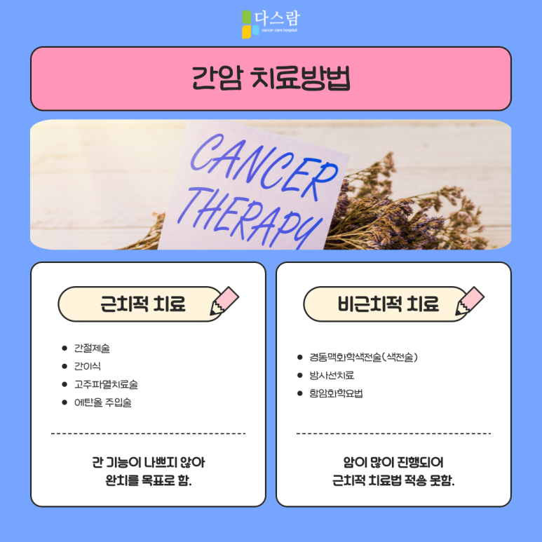- 근치적 치료 : 간절제술, 간이식, 고주파열치료술, 에탄올 주입술