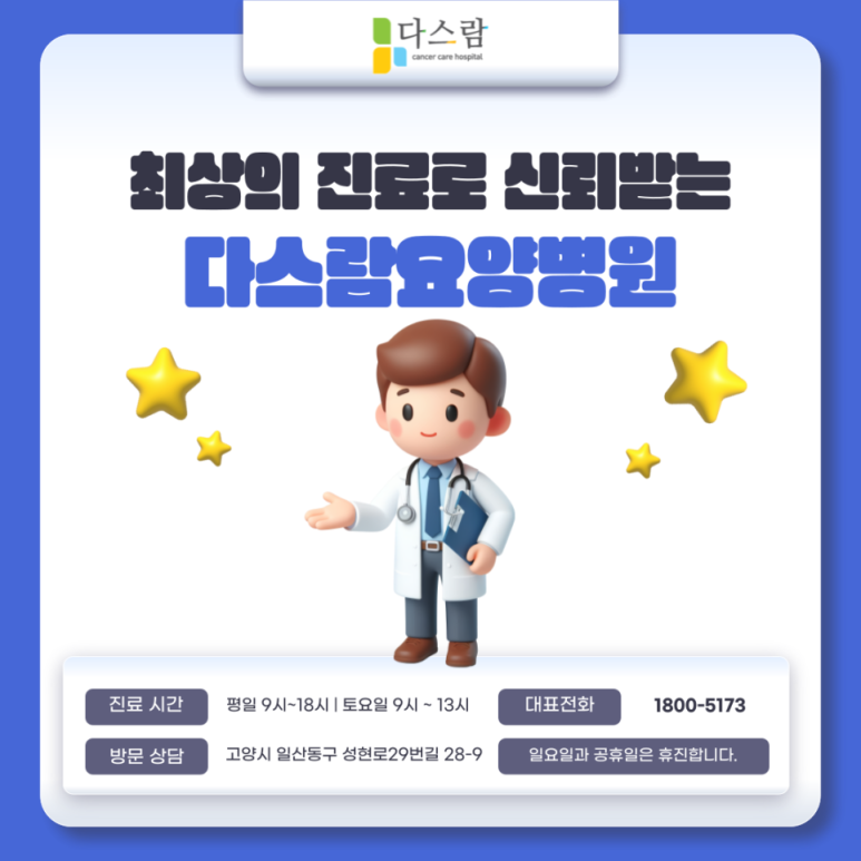 안녕하세요. 서울, 경기도 지역의 암요양병원으로 찾아주시는 다스람요양병원입니다.