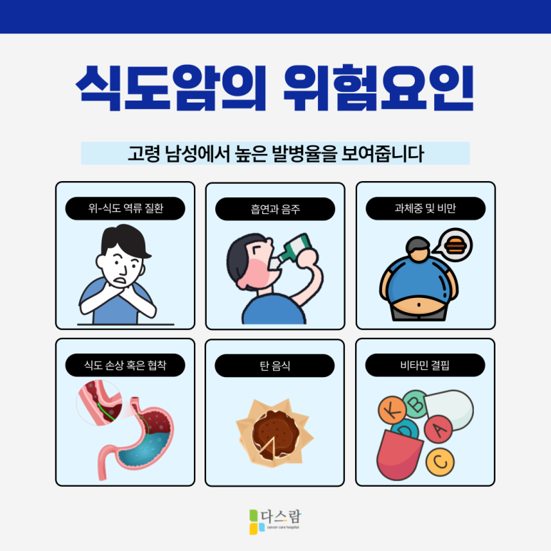 흡연도 식도암의 주요 위험 요인 중 하나인데요, 비흡연자에 비해 흡연자는 식도암 발병 위험이 3~4배 더 높아진다고 합니다. 그리고 뜨겁거나 염분이 많은 음식은 식도에 자극을 주기 때문에 암 발생 위험을 높일 수 있어 주의가 필요해요. 또한 요즘은 서구화된 식습관과 늦은 저녁 식사 후 바로 눕는 습관 때문에 역류성 식도염 환자가 늘고 있는데, 이런 상태를 오랫동안 방치하면 식도에 악성 종양이 생길 가능성도 높아질 수 있어요.