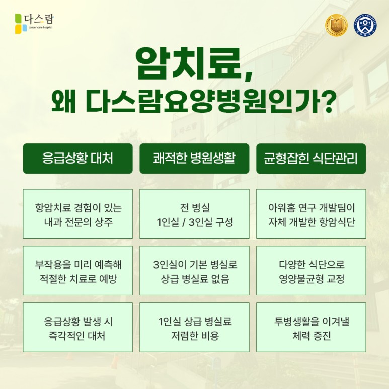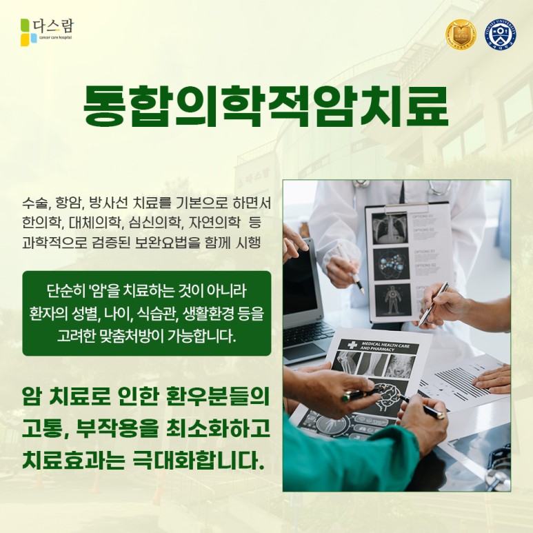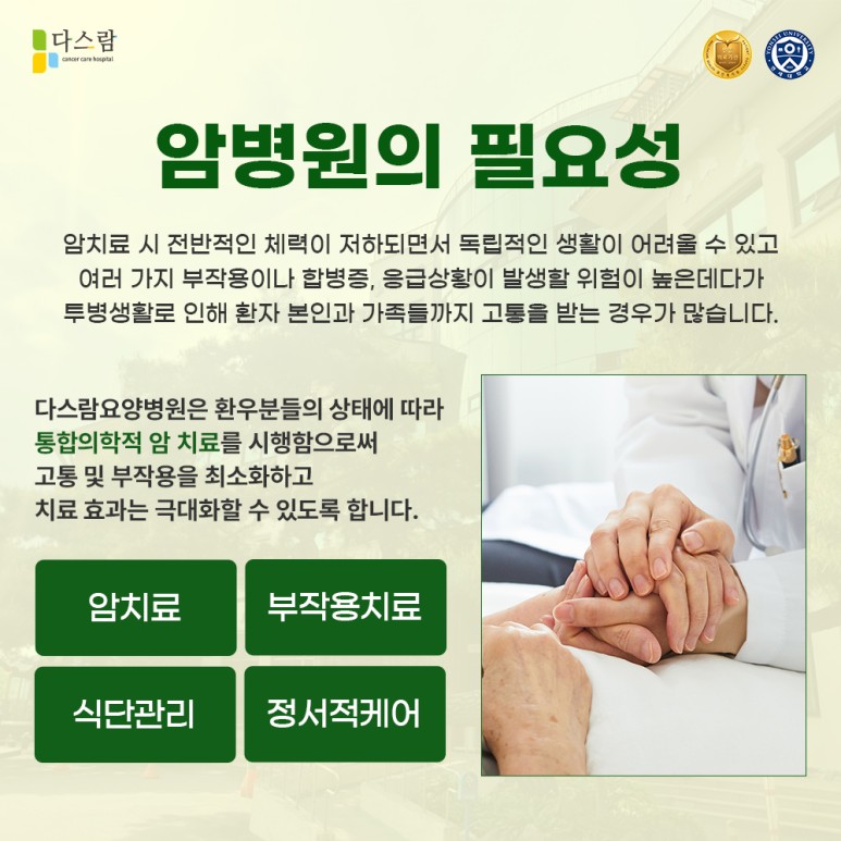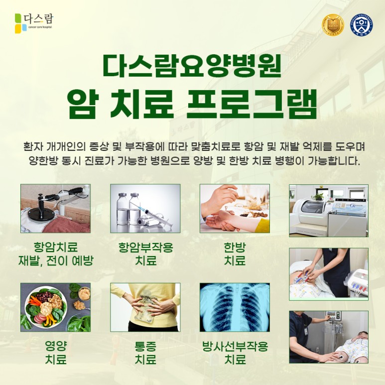 저희 다스람요양병원 역시 환우분들의 상태에 맞추어 통합의학적 암 치료를 시행함으로써 암 치료에 따르는 고통 및 부작용을 최소화하고 치료 효과는 극대화할 수 있도록 도움을 드리고 있습니다.