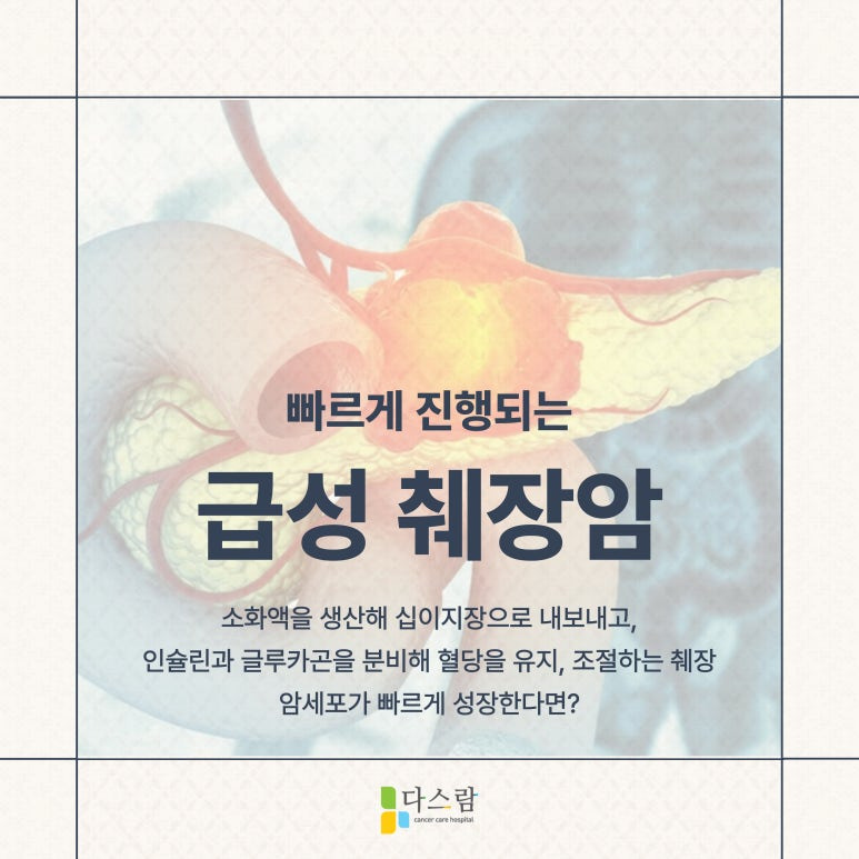 췌장은 우리가 섭취한 영양분을 분해하고 흡수하는 것을 도와주는 중요한 소화기관입니다. 많은 역할을 하고 있는 것에 비해 문제가 발생하였을 때 증상이 그다지 나타나지 않아 치료가 늦어지는 대표적인 신체기관 중 하나이죠. 오늘은 췌장에 나타나는 질환 중에서도 급성 췌장암에 대해 알아보려고 합니다.