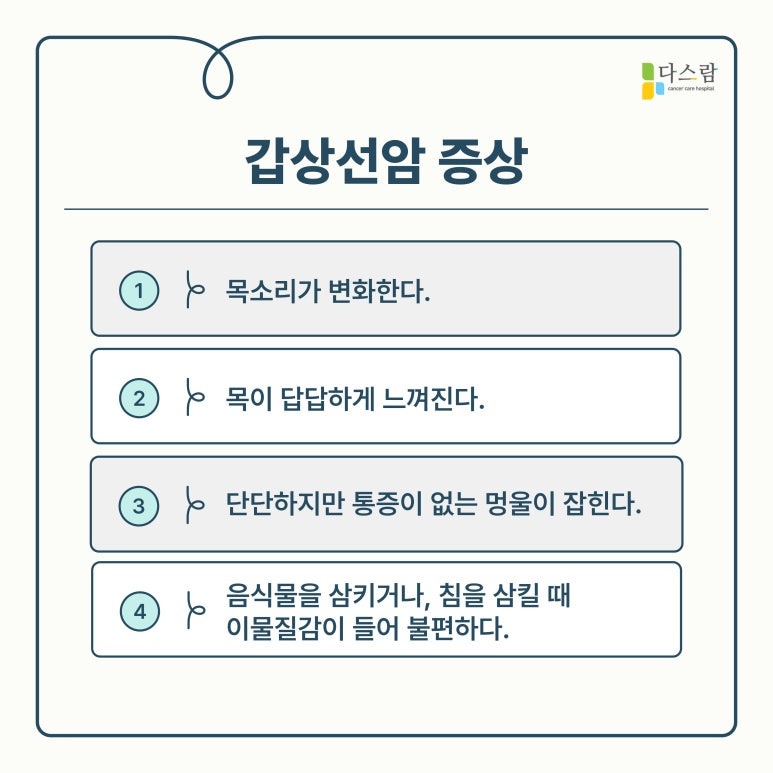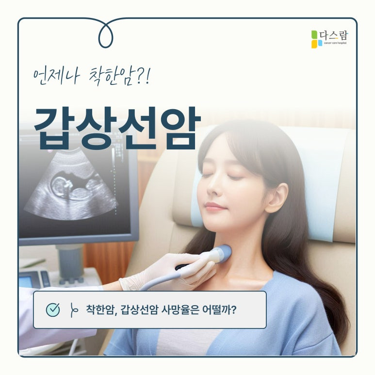 갑상선암은 조기 발견과 수술 후 관리가 사망률을 낮추는 핵심 요소입니다. 다스람요양병원은 일산암치료병원으로서, 체계적이고 전문적인 관리를 통해 환자들이 건강을 회복하고 삶의 질을 높일 수 있도록 최선을 다하고 있습니다. 특히 면역력 강화, 통증 완화, 맞춤형 식단 제공 등 환자 개개인의 필요에 맞춘 종합적인 치료를 제공함으로써 암 치료의 새로운 표준을 제시하고 있답니다. 이외에 추가적인 문의가 있으신 경우 내원하여 상담받아보시기 바랍니다.