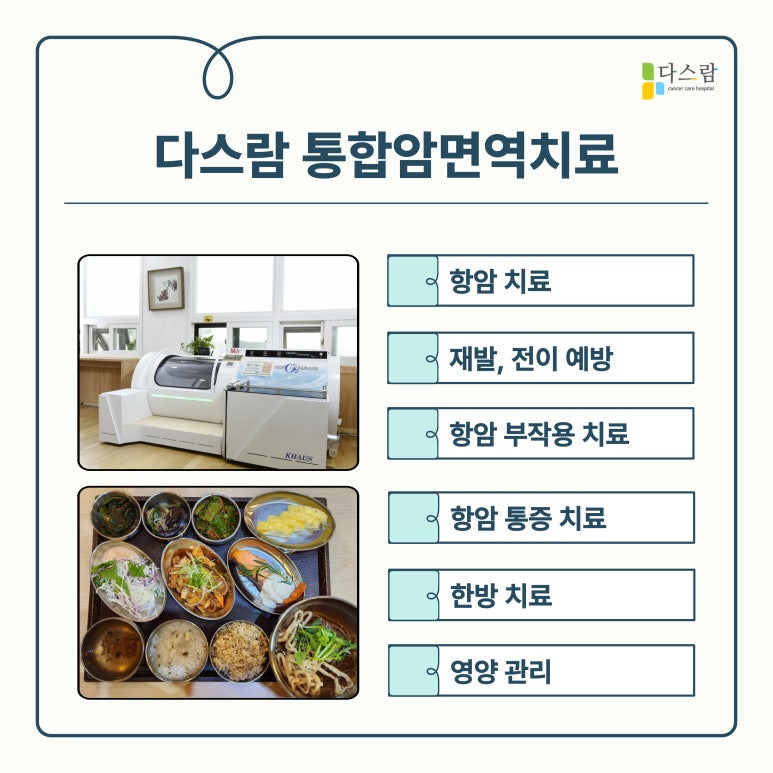 일산암치료병원으로 찾아주시는 저희 다스람요양병원은 갑상선암 수술 후 관리에 있어 체계적이고 전문적인 프로그램을 제공하고 있습니다. 환우분의 면역력을 높이고 통증과 부작용을 최소화하기 위해 다양한 치료 방법들인데요, 통합암면역치료를 통해 환자의 면역력을 강화하며, 정기적인 건강 체크와 맞춤형 영양 관리로 전반적인 건강 상태를 높이고 있어요.