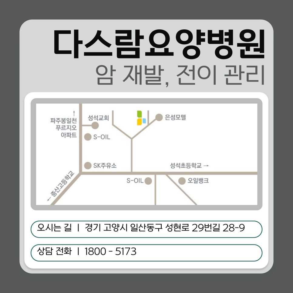 유방암은 조기에 발견하면 치료 결과가 긍정적이지만, 치료 이후의 관리도 매우 중요합니다. 유방암의 효과적인 치료를 고민하고 계신다면 암의 재발과 전이를 방지하기 위해서는 면역력 강화와 지속적인 건강 관리를 돕는 다스람요양병원을 내원하여 상담받아보시기 바랍니다.