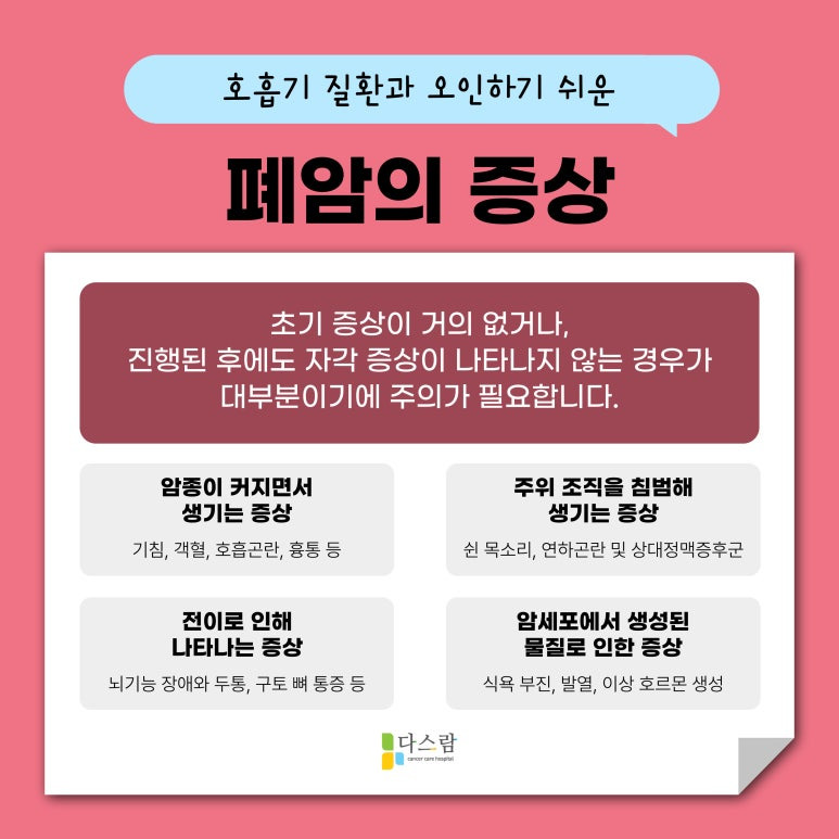 더군다나 폐암의 경우 초기에는 증상이 뚜렷하지 않아 조기 발견이 어려운 암종인데요, 종양이 커지면서 점차 증상이 나타날 수 있어요.