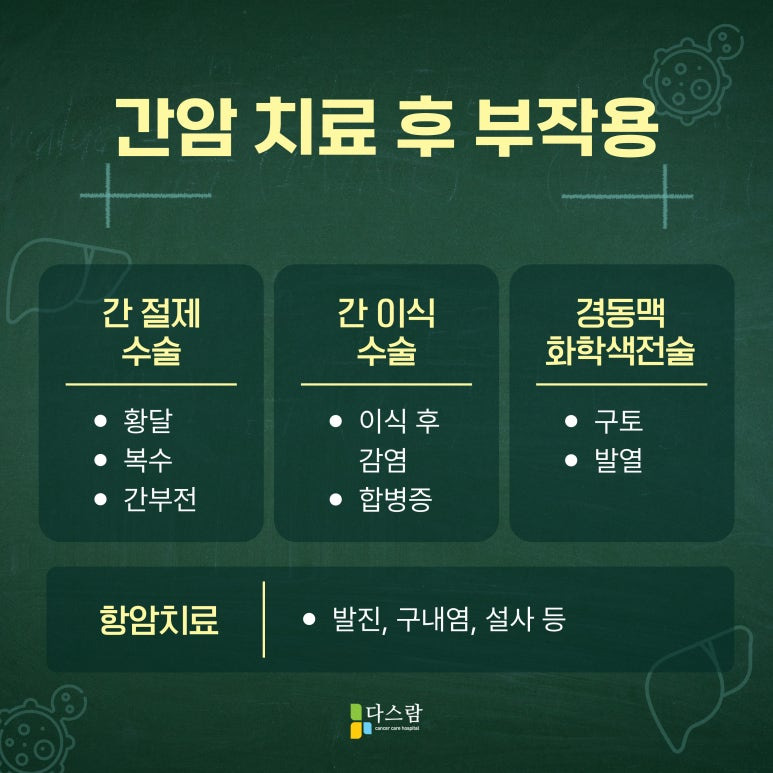 간암 치료는 발견된 시기에 따라 상이합니다. 일반적으로 수술적 절제, 간이식, 방사선 치료, 항암 치료 등을 진행하게 되는데, 특히 항암 치료는 암세포를 제거하는 데 효과적이지만, 동시에 정상 세포에도 영향을 미쳐 다양한 부작용이 발생할 수 있어 주의가 필요하죠.