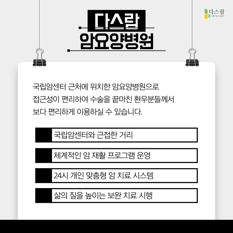 국립암센터는 국내에서 암 치료를 선도하는 대표적인 의료 기관입니다. 하지만 이곳에서 항암 치료를 받은 이후에도 지속적이고 꾸준한 면역 관리와 재활이 필요하죠. 때문에 해당 기관 주변에 위치하여 가까운 요양병원을 찾는 것이 중요한데요, 다스람요양병원은 국립암센터 근처에 위치하여 환자분들이 더욱 편리하게 방문할 수 있도록 돕고 있습니다.