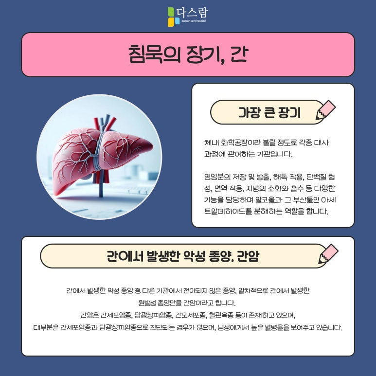 간은 우리 몸에서 해독 작용, 영양소 대사, 면역 조절 등 중요한 기능을 수행하는 장기입니다. 때문에 간에 악성 종양이 발생하면 신체 전체적인 균형이 무너지고 다양한 증상이 나타날 수밖에 없어요. 하지만 많은 환자분들이 간 건강이 악화되었음을 깨닫지 못한 채 생활하다가 병이 진행된 후에야 병원을 찾는 경우가 많습니다. 오늘은 다스람요양병원과 함께 간암의 원인과 증상, 치료 과정에 대해 알아보겠습니다.