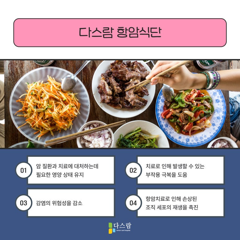 저희 다스람요양병원에서는 간암 환우분들을 위해 체계적인 항암식단을 제공하고 있어요. 아워홈 자체 연구팀에서 개발한 항암식단을 바탕으로, 매일 신선한 식재료를 사용해 당일 조리하는 원칙을 고수하고 있어요. 이를 통해 환자분들께 최상의 영양을 제공하며, 식사의 질을 높이고 있죠.