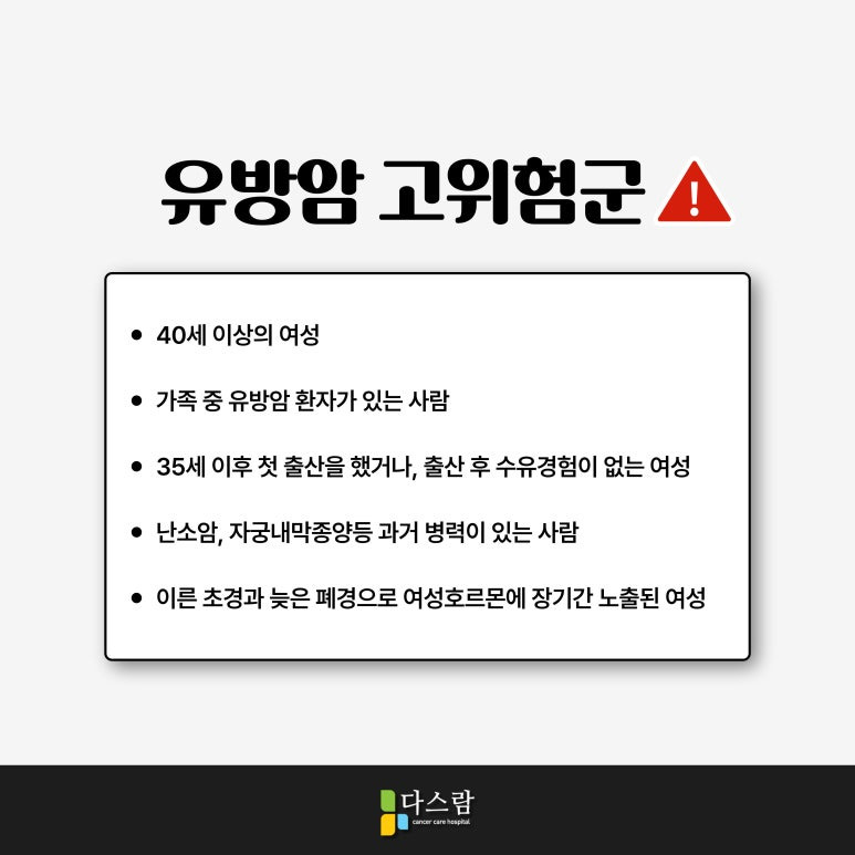 그렇다면 어떤 분들이 유방암 발병률이 높을까요? 유방암은 특히 유전이나 여성 호르몬에 영향을 많이 받는것으로 알려져 있는데요, 이에 따라 대표적인 고위험군은 다음과 같습니다.