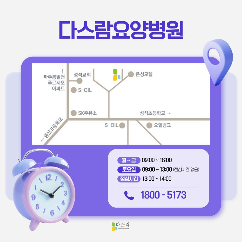 암 치료는 단순히 병을 치료하는 것이 아니라, 환자의 전반적인 건강을 회복하는 과정이기도 해요. 항암치료를 받으면서 신체적으로나 정신적으로 힘든 시간을 보낼 수 있지만, 적절한 관리와 치료를 병행하면 보다 나은 결과를 기대할 수 있습니다. 다스람요양병원에서는 환자 한 분 한 분의 상태를 세심하게 살펴보고, 최적의 치료 환경을 제공하고 있어요. 만약 암 치료와 이후 관리를 어떻게 해야 할지 고민하고 있다면, 일산암요양병원으로 찾아주시는 저희 다스람요양병원을 내원하여 상담받아보시기 바라요.