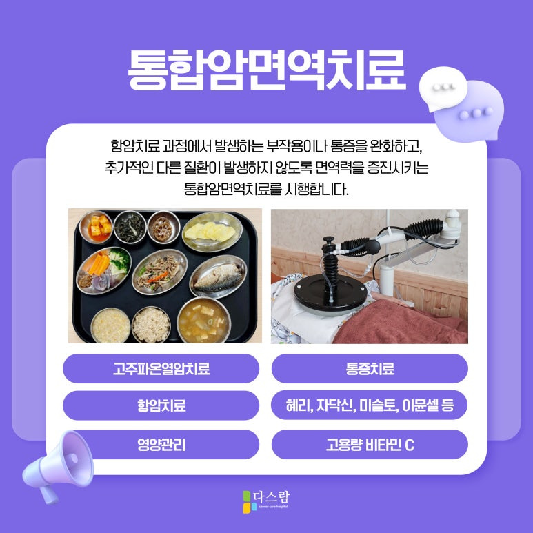 다스람요양병원에서는 항암치료를 받는 환우분들이 보다 안정적으로 치료를 이어갈 수 있도록 다양한 면역치료 프로그램을 운영하고 있어요. 통합암면역치료는 항암치료의 부작용을 줄이고, 면역력을 높여 회복을 돕는 치료 방법이에요. 환자의 상태에 맞춘 맞춤형 치료를 통해 체력을 보강하고, 암세포가 다시 증식하는 것을 예방하는데 초점을 맞추고 있죠. 또한, 항암식단을 제공해 환자의 영양 상태를 체계적으로 관리하며, 심리적인 안정까지 고려한 치료를 진행하고 있답니다.