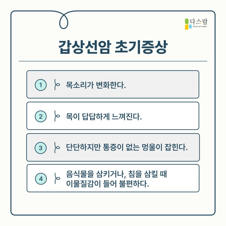 초기 갑상선암은 특별한 증상이 없는 경우가 많아 조기 발견이 어렵습니다. 하지만 목에 혹이 만져지거나 갑상선 기능 저하로 인한 피로감, 체중 변화, 목소리 변화 등이 나타날 수 있는데요, 만약 평소와 다르게 음식을 삼키기 어려운 증상이 지속된다면 정밀 검사를 받아보는 것이 좋습니다. 갑상선암은 조기에 발견할수록 치료 성공률이 높아지므로 정기적인 검진이 중요하기 때문이죠.