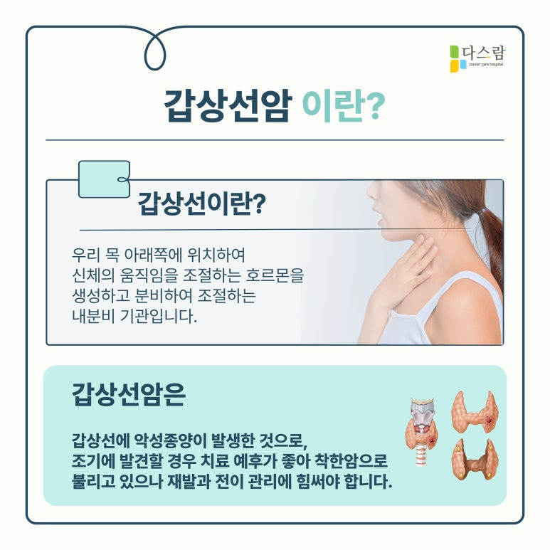 갑상선암은 갑상선에서 발생하는 악성 종양으로, 유전적 요인, 방사선 노출, 요오드 섭취 불균형 등 다양한 원인에 의해 발생할 수 있습니다. 갑상선은 우리 몸의 대사를 조절하는 중요한 기관이기 때문에 기능이 저하되거나 과활성화될 경우 신체 전반에 영향을 미칠 수 있습니다. 따라서 치료 이후에도 지속적인 관리가 필요하죠.