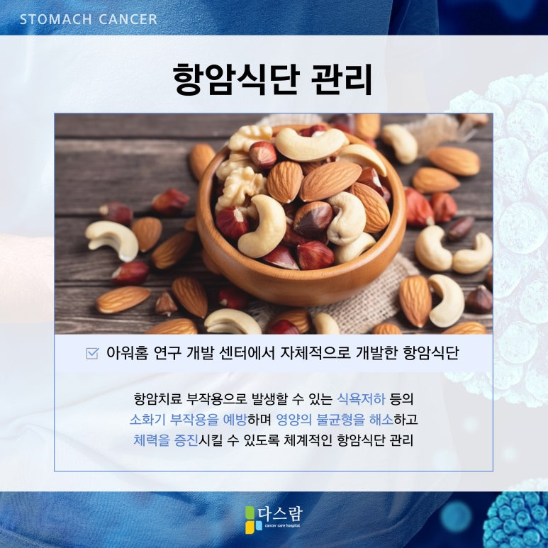 다스람요양병원에서는 위암 환자분들을 위해 체계적인 항암 식단을 제공해 드리기 위해 최선을 다하고 있습니다. 아워홈 연구팀이 자체 개발하는 암종별 항암식단을 기본으로 환자분 개별 특성을 고려하여 매일 아침 신선하게 조리되어 제공해 드리고 있는데요, 위암의 경우 소화가 잘 되는 음식 위주로 구성하여 덤핑증후군을 예방하고, 영양 균형을 맞춰 체력 회복을 도와드리고 있어요. 또한 개별 상태를 고려해 맞춤형 식사를 제공하여 보다 안전하게 영양을 보충할 수 있도록 힘쓰고 있죠.