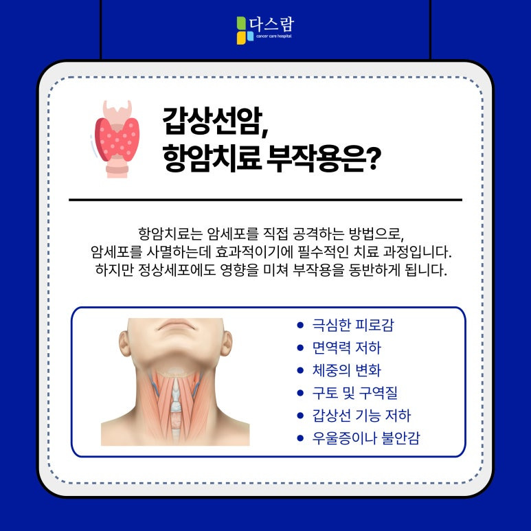 이번 글에서는 갑상선암의 항암치료 과정에서 나타날 수 있는 주요 부작용과, 이를 완화하고 치료하는 방법에 대해 자세히 알아보겠습니다.