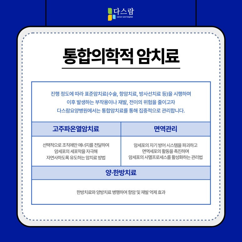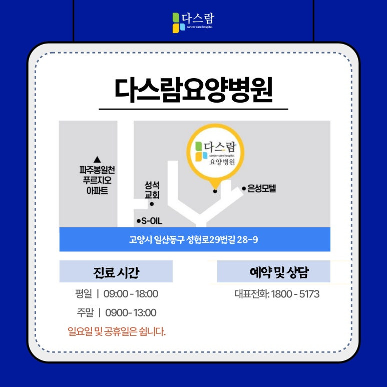 일산암요양병원으로 찾아주시는 저희 다스람요양병원에서는 환자분들이 항암치료의 후유증을 보다 효과적으로 극복하실 수 있도록