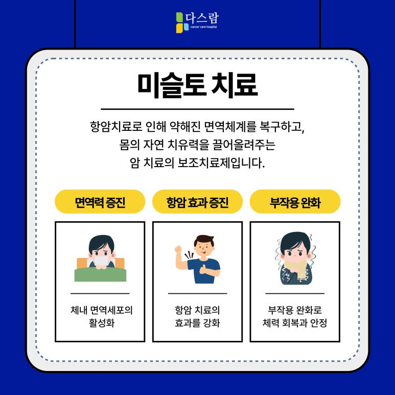 미슬토는 면역세포를 활성화시켜 면역력을 높이고, 항암 효과를 더욱 강화하는 데 도움을 줄 수 있습니다.