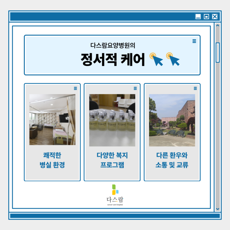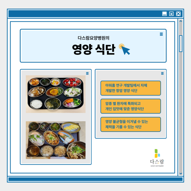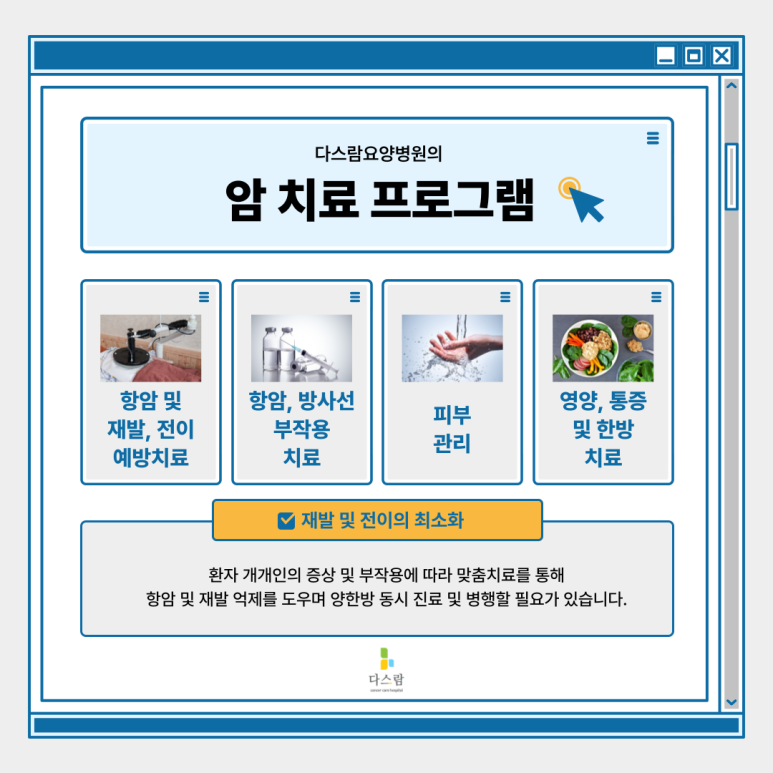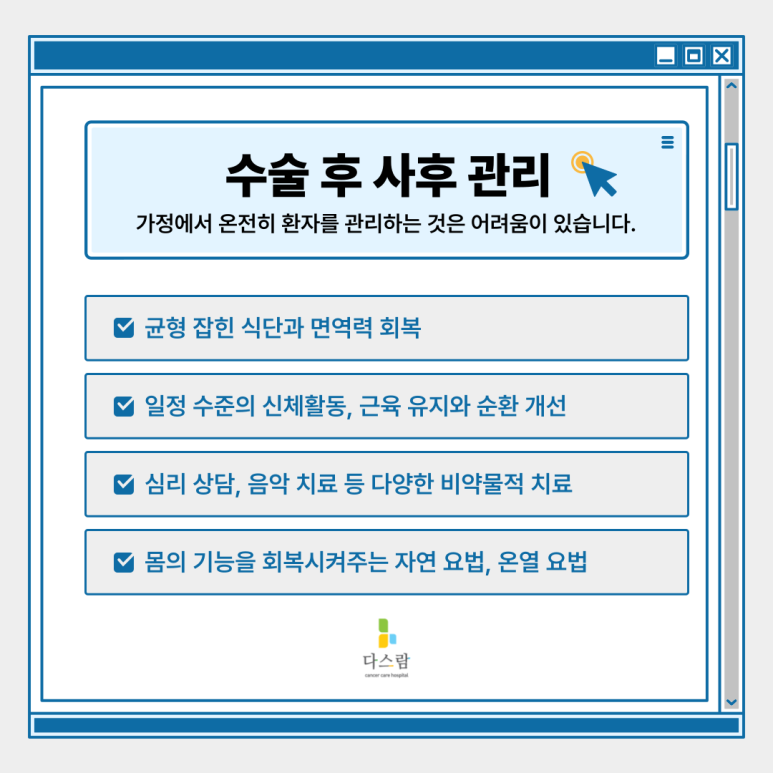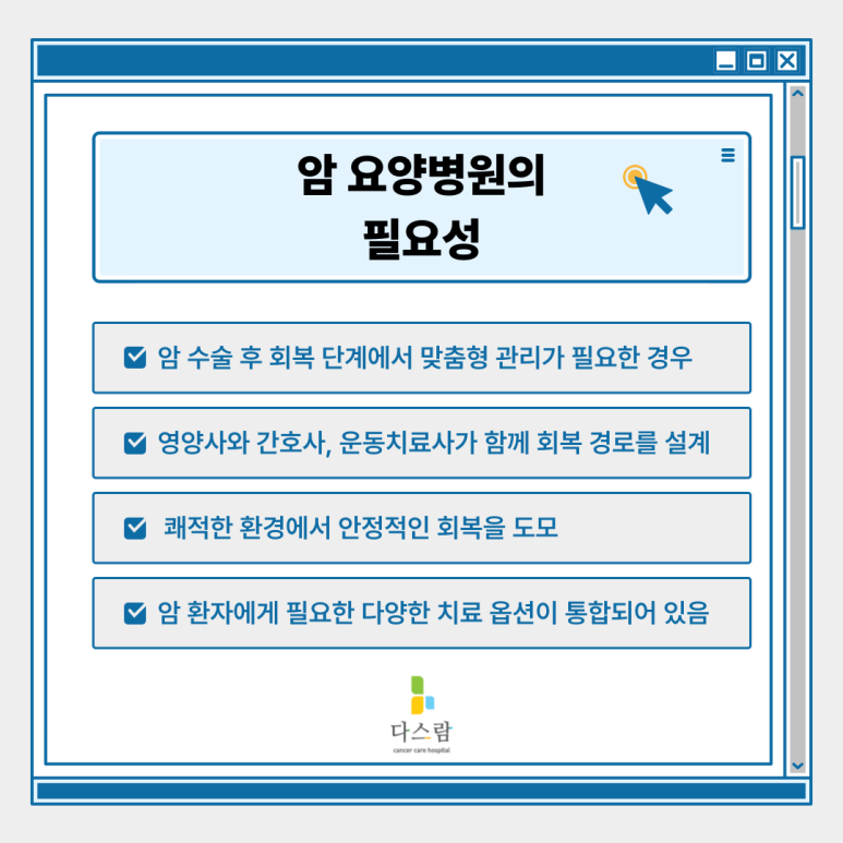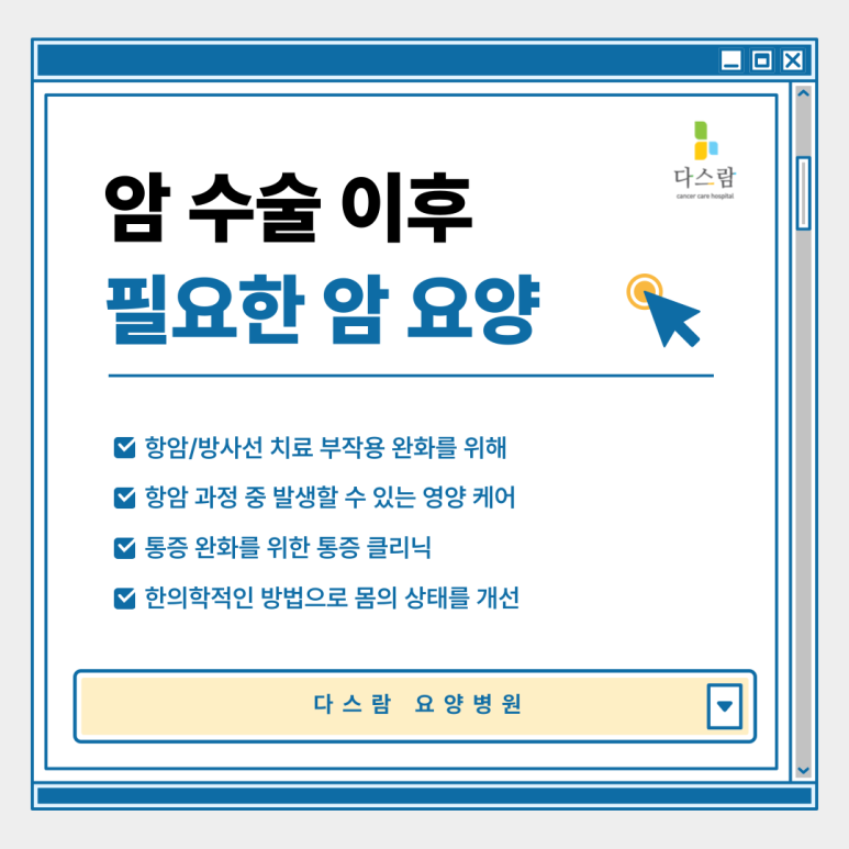 오늘 다스람요양병원에서는 암 수술 후 재활치료의 중요성부터, 실제로 어떤 사후 관리 방법들이 있는지, 그리고 환자에게 필요한 치료 프로그램에는 어떤 것들이 있는지까지 단계별로 꼼꼼히 알아보겠습니다.