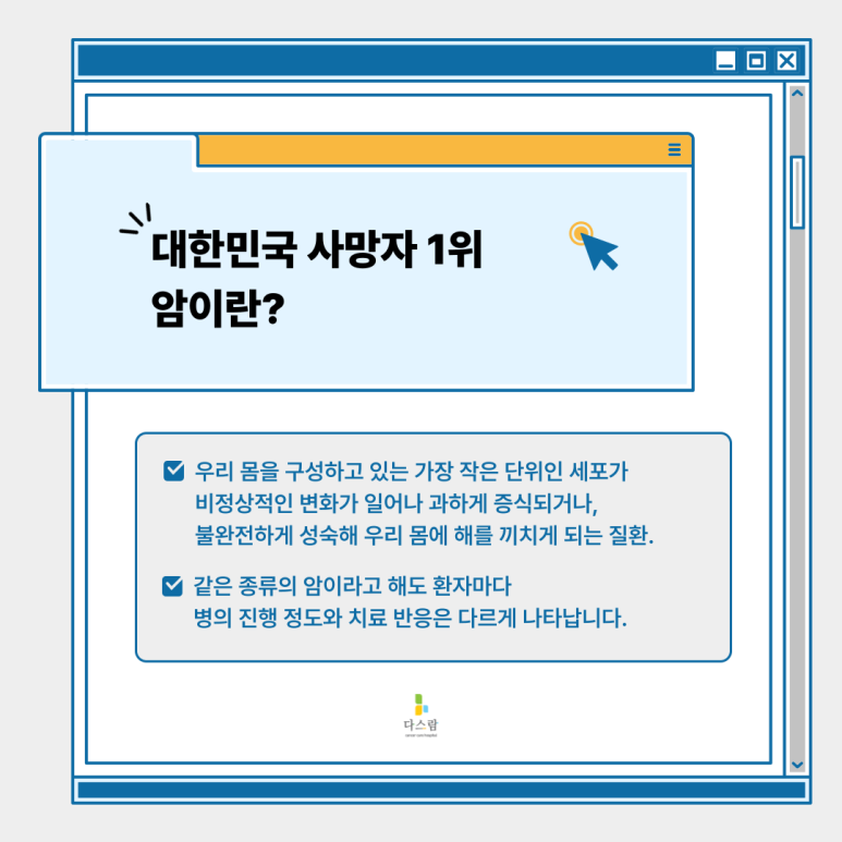 암은 우리 몸의 세포가 비정상적으로 증식하면서 건강한 세포의 기능을 방해하는 질환입니다. 원래 세포는 생명 활동에 맞춰 자연스럽게 생성되고 사라지지만, 암세포는 이러한 자연스러운 주기를 무시하고 끊임없이 분열을 반복합니다.