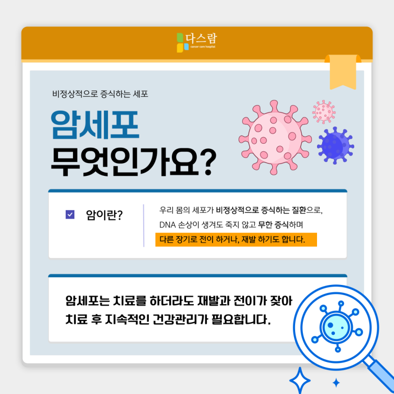 ‘암’은 신체의 세포가 정상적인 생명주기를 벗어나 무질서하게 자라나는 상태를 말합니다. 우리 몸의 세포는 일정 시간 후 자연스럽게 죽고 새롭게 생성되며 균형을 유지하는데, 이 과정이 깨지고 과도하게 증식하면서 종양을 형성하면 문제가 됩니다.