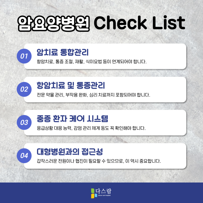 암 치료 이후 요양병원을 선택할 때는 단순한 편의성보다, 환자의 건강 회복과 안전한 치료 연계가 가능한 병원인지 여부를 따져봐야 합니다. 아래와 같은 항목들을 체크해보세요.