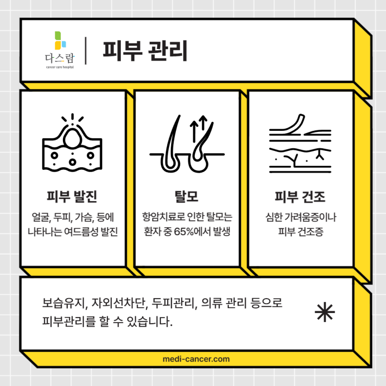항암제는 피부에도 적지 않은 영향을 미칩니다. 피부 건조, 가려움증, 발진, 탈모 등이 흔히 나타나는 증상인데요, 이는 외모 변화뿐 아니라 감정적으로도 부담을 줄 수 있습니다.