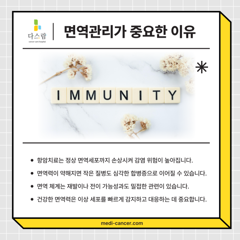 면역력이 떨어지면 감염에 대한 방어력뿐 아니라, 암 재발이나 전이 가능성에도 영향을 줄 수 있습니다. 실제로 많은 연구에서 암 생존자들의 면역 상태와 예후 사이에 밀접한 연관성이 있다는 점이 확인된 바 있습니다.