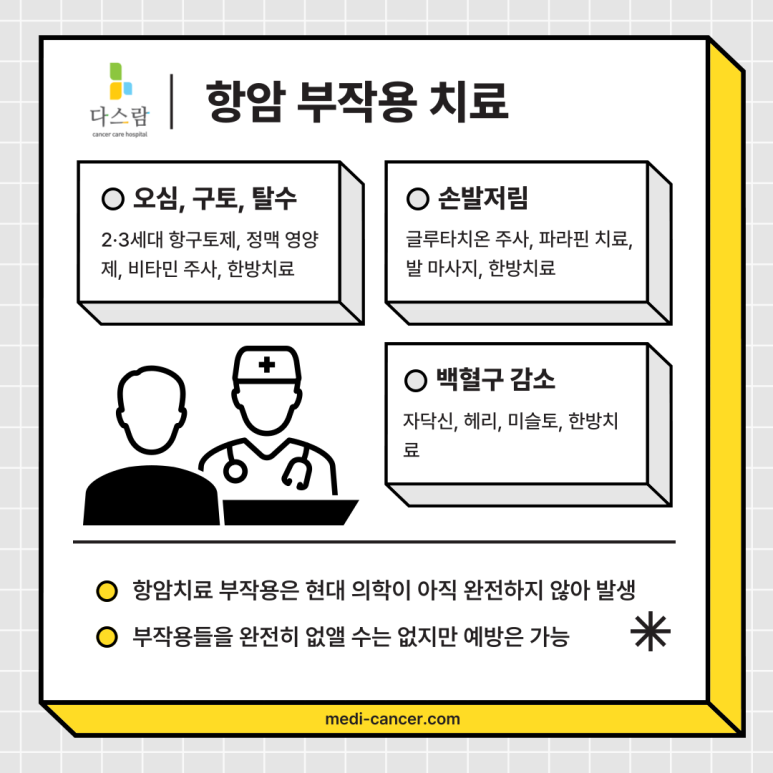 이런 증상들은 치료 후에도 일정 기간 지속될 수 있고, 환자분의 삶의 질을 크게 떨어뜨릴 수 있습니다. 이 때문에 단순히 치료를 '끝냈다'고 안심하는 것이 아니라, 몸이 회복하고 일상으로 돌아가기 위한 추가적인 관리와 치료가 반드시 필요합니다.
