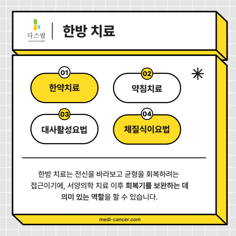무엇보다 한방 치료는 전신을 바라보고 균형을 회복하려는 접근이기에, 서양의학 치료 이후 회복기를 보완하는 데 의미 있는 역할을 할 수 있습니다.