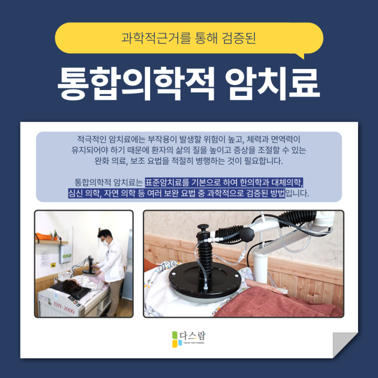 단순히 암 조직만을 제거하는 것에서 벗어나, 신체 전반의 균형을 맞추는 방식의 암 치료가 점점 주목받고 있습니다. 이른바 '통합의학적 암 치료'라고 불리는데요.이 치료 방식은 심신의 안정을 포함해 식이요법, 운동, 스트레스 관리, 면역 활성, 온열 요법 등을 포괄적으로 다룹니다.