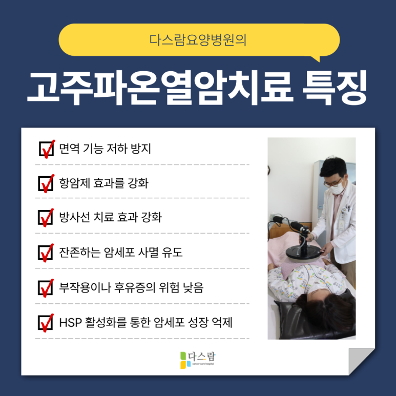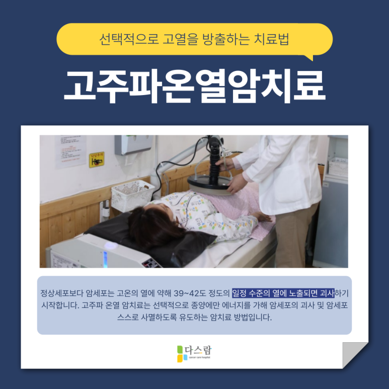 또한 열을 가하면 혈류가 증가하면서 산소 공급이 원활해지고, 이로 인해 방사선치료나 항암제의 효율이 높아질 가능성도 함께 제시되고 있습니다. 이 치료는 단독으로 사용되기보다는, 기존 치료와 병행하는 보완적 방법으로 쓰이는 경우가 많습니다.