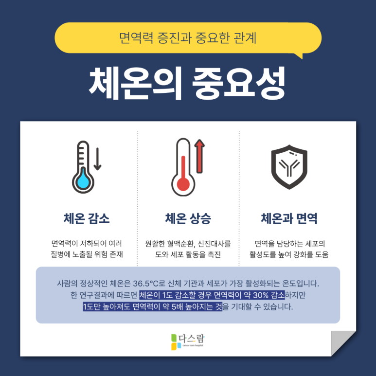 사람의 체온은 생각보다 많은 기능과 연결되어 있습니다. 특히 면역력과 체온의 상관관계는 꽤 밀접합니다.보통 정상 체온은 36.5도 전후인데요. 만약 체온이 1도만 떨어져도 면역 기능은 약 30% 감소한다고 알려져 있습니다.
