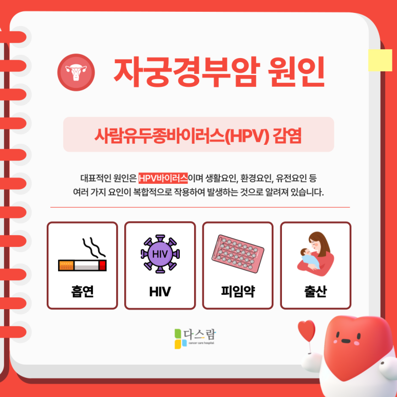 - 출산 경험: 출산 횟수가 많은 여성일수록 자궁경부에 가해지는 물리적 스트레스가 크기 때문에 암 발생과의 연관성이 있다고 보고되고 있어요. 특히 다출산 여성의 경우 HPV 감염 시 암으로 진행될 위험이 조금 더 높습니다.