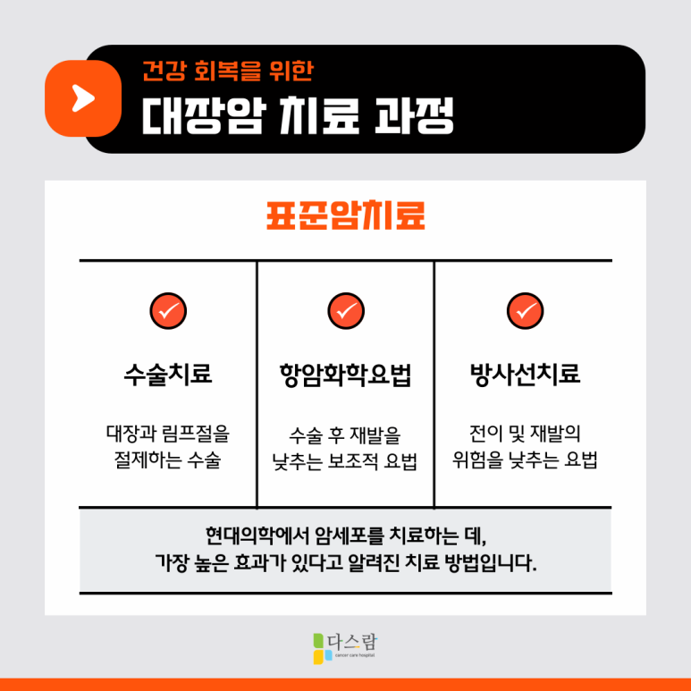 가장 기본이 되는 치료법입니다. 암이 국소에 국한되어 있다면 암 조직과 주변 림프절을 함께 절제하는 방식으로 수술이 진행됩니다. 일부 경우에는 장루가 필요할 수도 있습니다. 수술 후 장 기능이 회복될 때까지 일정 기간이 필요하며, 그동안의 식사 조절이 매우 중요합니다.