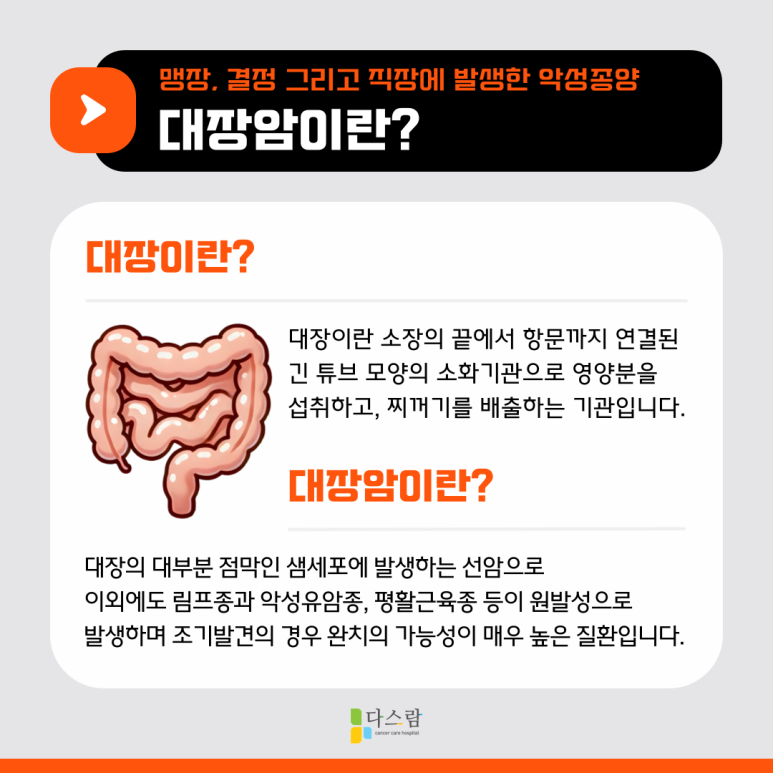 대장암은 대장에 생기는 악성 종양입니다. 초기에는 별다른 증상이 없어 조기 발견이 쉽지 않지만, 진행됨에 따라 변비와 설사, 혈변, 복부 불편감 같은 증상들이 나타나기 시작합니다. 대부분은 대장 내에 생긴 용종에서 시작하여 시간이 지나면서 악성으로 변하는데요, 정기적인 대장내시경 검진이 예방과 조기 발견의 열쇠입니다.