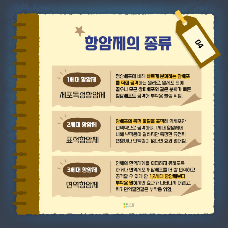 가장 오랜 역사를 가진 항암제입니다. 빠르게 분열하는 세포를 무차별적으로 공격하기 때문에 암세포뿐 아니라 모발, 소화기관 세포 등에도 영향을 줍니다. 그래서 탈모나 구토 같은 부작용이 흔하게 나타납니다.