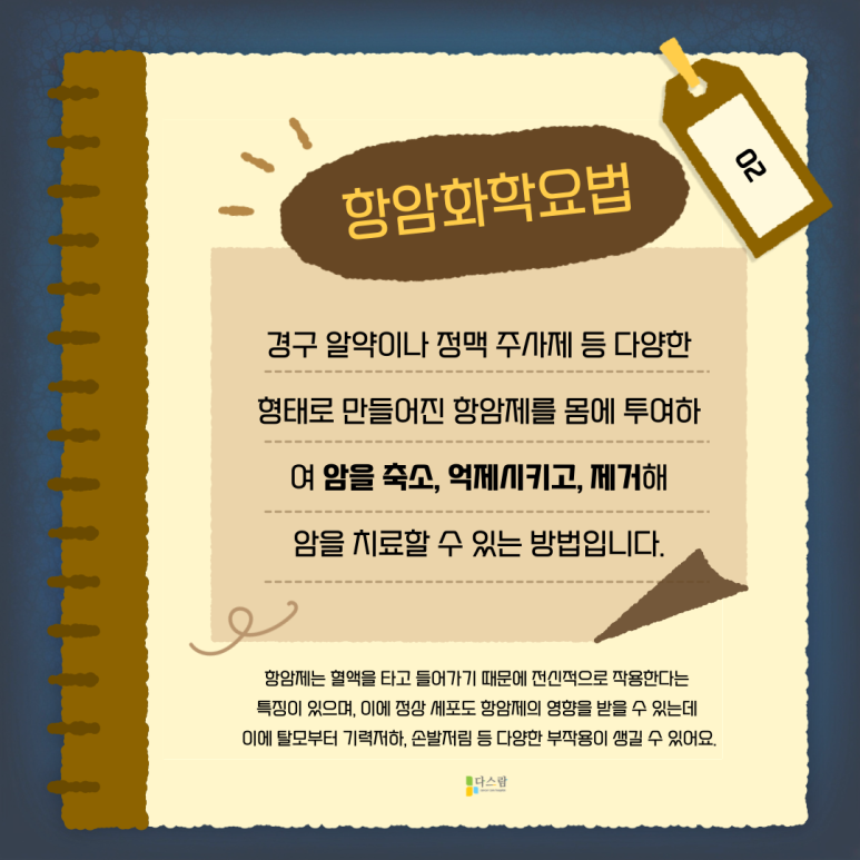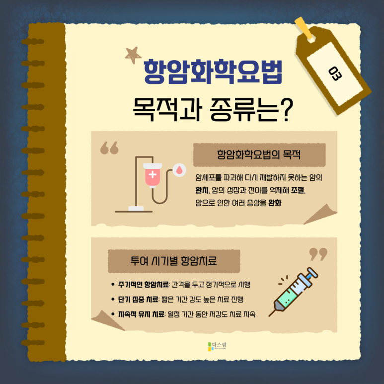 - 항암화학요법은 약물을 이용해 암세포를 제거하거나 성장을 억제하는 치료입니다. 전신을 순환하면서 작용하기 때문에 보이지 않는 암세포까지 공격할 수 있다는 장점이 있습니다.