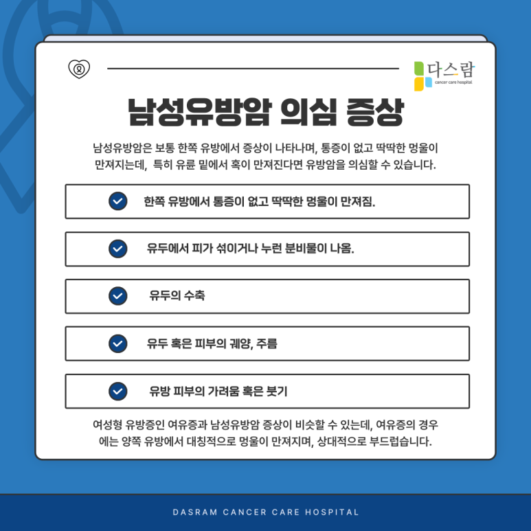 남성유방암은 일반적으로 한쪽 유방에서 증상이 나타나는 것이 특징입니다. 가슴에서 통증이 없는 멍울이 만져지는데, 특히 유륜 밑부분에서 딱딱한 혹이 만져진다면 유방암 혹은 여유증이나, 양성 유방 종양 등의 다른 유방 질환을 의심할 수 있어요. 이와 함께 나타날 수 있는 증상으로는