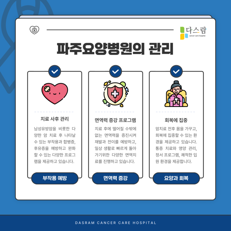 이처럼 파주요양병원에서는 남성유방암을 비롯한 다양한 암 치료 후 나타날 수 있는 부작용과 합병증, 후유증을 예방하고 완화할 수 있는 다양한 프로그램을 제공하고 있습니다. 또한 치료 후에 떨어질 수밖에 없는 면역력을 증진시켜 재발과 전이를 예방하고, 일상 생활로 빠르게 돌아갈 수 있도록 다양한 면역치료를 진행하고 있습니다.