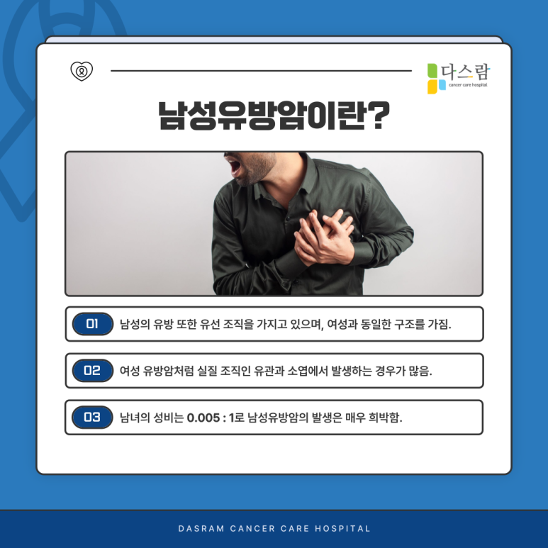 보통 유방암이라고 하면, 여자에게만 발생한다고 생각하시는 분들이 계십니다. 유방이 여성의 전유물이라고 생각해서일까요? 드물지만 남성에게도 유방암이 발생할 수 있는데요. 오늘 파주암병원에서는 남성유방암에 대해 알아보려고 합니다.