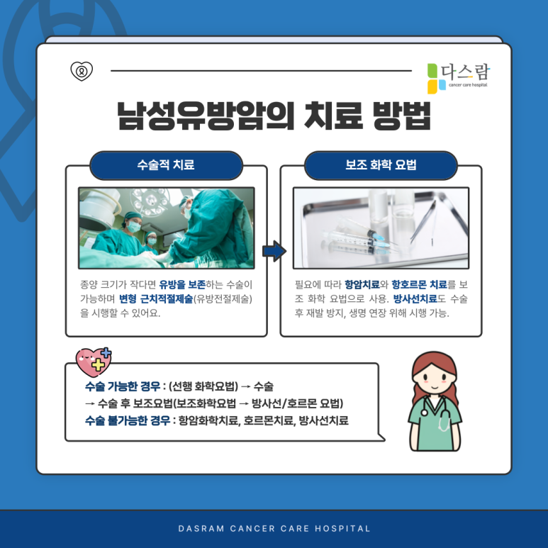 남성유방암 치료는 여성의 유방암 치료와 크게 다르지 않습니다. 수술적 치료를 기본으로, 필요에 따라 항암 치료와 항호르몬 치료를 보조적 화학 요법으로 사용할 수 있죠. 표준암치료 중 하나인 방사선 치료도 수술 후 재발 방지와 생명 연장을 위해 시행하기도 합니다.